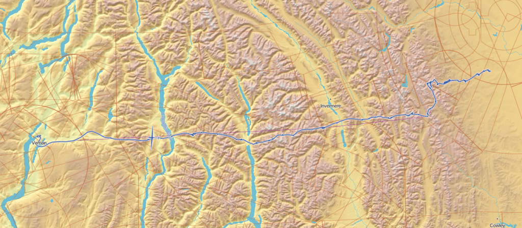 Day 1, straight over the rocks to VernonNot many places to landThe Selkirks are really impressiveAfter every major valley crossing, I struggle to reconnect with lift. Flying east-west across the Rockies is not ideal, much easier to stay aligned with the ridges north-south.Over the Monashees. Never been this far west before. All downhill to Vernon, I contact my Aunt/uncle to pick me up at the airport. The whole flight was into a 25km/h headwind.Okanagan. Vernon is the largest airport I’ve landed at.I have a very hard time getting away from the low country around Vernon. A week from now, there is a huge fire here (Duncan Lake)Coming up on the Purcells where I screw up and get low over Jumbo pass.I could have flown back to CuNim, but why cut the fun short? Pavan and I stay at Martin’s house at Fairmont Hot Springs.