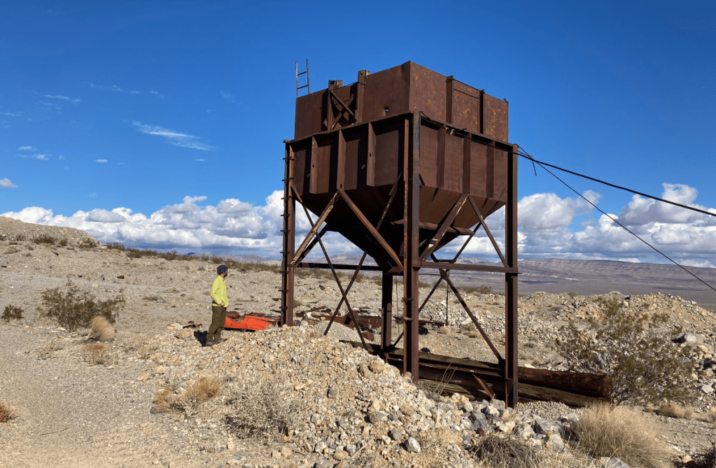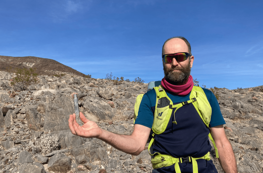 High clearance definitely required. We are about 10 hours drive from Asphalt. To be towed to Asphalt is $3000 USDWe could see a weird structure in the desert from hours away. Marta guessed a building, I guessed trees. This is the Saline Valley clothing-optional Warm Springs. As we pulled up, the manager was out raking, wearing only sandals. On the big holidays, there can be up to 400 people here!Pretty large calibre for random brass. Found a few more of these, along with machine gun links. So fell from the sky, probably P-51 mustang in WWII. 50 CalThe ridges are spectacular, and go forever. Massive country. Lots of volcanism to look at. Just behind the Inyo mountains to the west are the Sierra Nevada.Spectacular basin and range geography. Lots of interesting charactersFun to puzzle out how people mined on the cheap. Probably gypsum?We try to drive out over the North Pass, but deep snow in the last couple miles stops us. The manager from the hot springs (now wearing clothes) is ahead of us with a chained up jeep wrangler, and he gives up.No choice but to drive south for 7 hours to the south pass. Saline Valley is a huge trap, a February snowstorm could strand several hundred hot-spring goers for weeks.