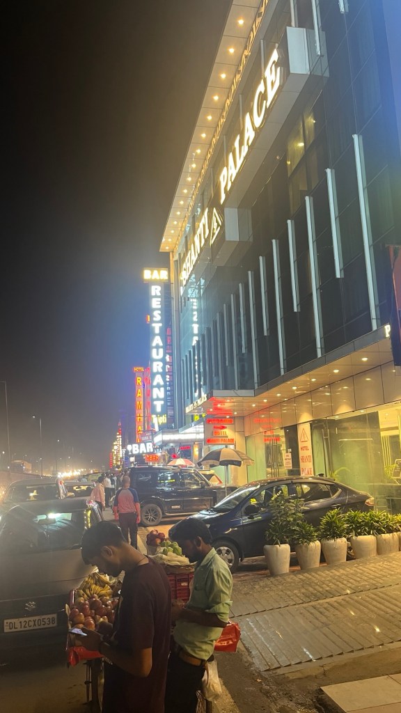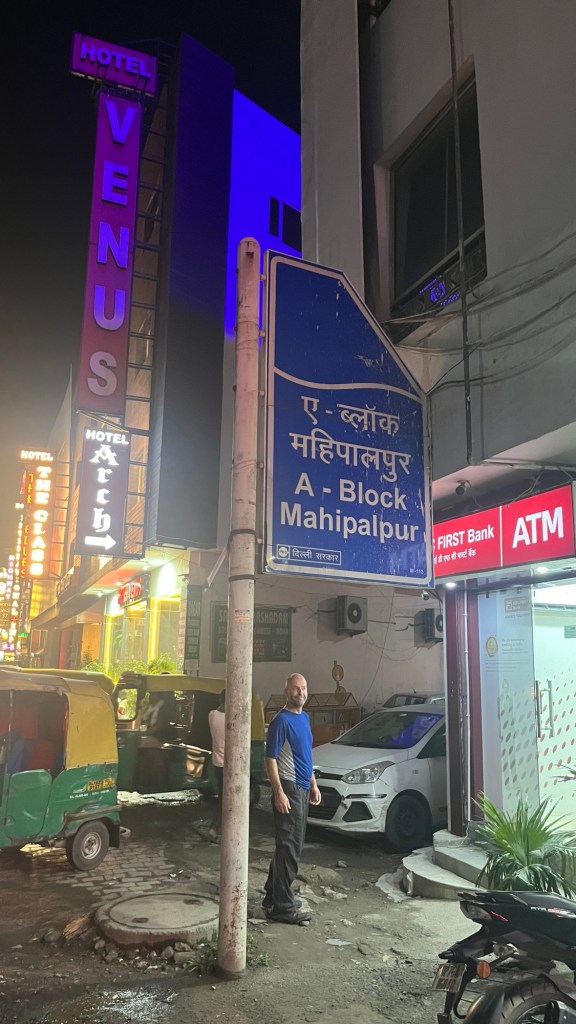 We booked the cheapest hotel we could find in Mahipalpur village beside the airport. No toilet paper, no towels but has hot water. Reviewed at 1.2/10 stars. Pretty good, really. I’ve stayed in worse – looking at you, hostel in Xian. Every time you flushed the toilet at night, a cup of cold water would dump out of the ventilation system above you Look at this fancy street. We’re not staying here. A guy was trying to convince me to go get a massage. Who knows what the service really was but when Marta caught up and I told him that my wife wouldn’t appreciate that, he looked a little guilty.Our first meal in India was mind blowing cheap and delicious. For some reason, they charged us less than the prices on the menu.