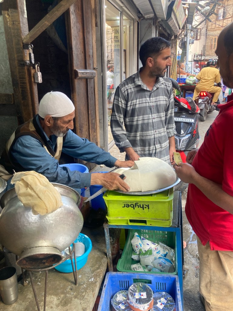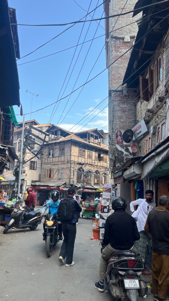 This cheese shop was about 1 square meter. While we got our SIM cards here, several heavily covered up Muslim women tried begging. I’m not sure if they are hard up, or this is just a nice supplement. We ditched our chaperone. Deep fried goodiesPistachio popsicleTrip to currency exchange. I didn’t think through what converting Benjamins into 500 rupee notes would entail. The exchange rate was very good, implying there are currency controls and this transaction was on the black market Interesting mix of construction techniques. The city feels old – historical Houseboat. There are hundreds of these on Dal lakeA small selection of houseboats. Most only accessible by water. The water is very clean, surprisingly. No one is leaking gasoline or engine oil into here. Probably gas engines are banned. Private dinner for us on the houseboat. Our “chaperones” watch us eat dinner, which feels creepy, but we later learn is cultural and normal.