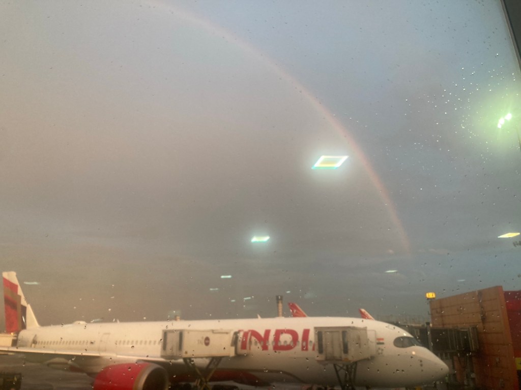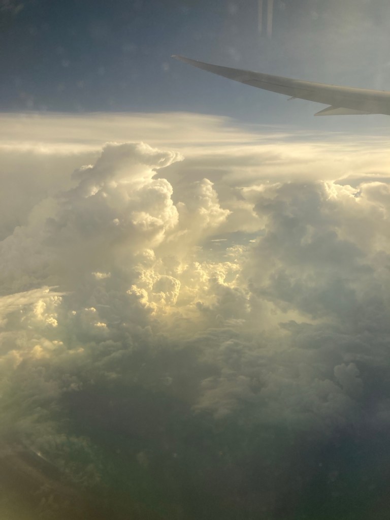 Our jet weaved across China dodging huge cumulonimbus clouds. We must’ve crossed the Himalaya somewhere, buried in the clouds.Rainbows are never as vibrant in photos
