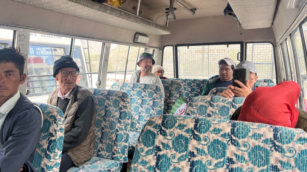 Suddenly, a likely bus arrived. The bus didn’t quite stop, passengers were getting off, we were trying to figure out if the bus was going in the right direction, while jogging along side. Snap decision – jump on and figure it out later. Apparently not going to Mulbekh (our next destination) but the right direction. And cheap – $2.50 for a 60km bus ride. Even worse than Zoji La pass – high speed downhill, aggressive braking.