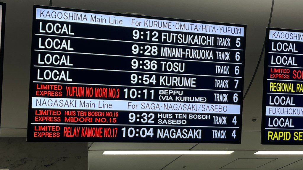 In Fukuoka, we were warned that the next train heading toward Yufuin would likely be canceled as well. The JR service center recommended taking a bus instead, as they couldn’t guarantee the train would make it through the mountains in such conditions. However, we had our JR passes and were determined to use them rather than pay extra for bus tickets.