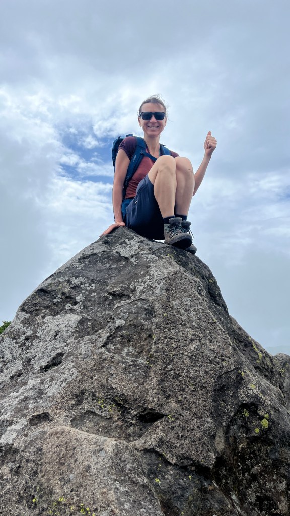 We started hiking at 10:03 AM. The sound of cicadas at the beginning was both exotic and deafening. After the first kilometer, the trail changed from concrete to dirt, which was much nicer. In a few places, we encountered short ladders. The day was warm, misty, and had an enchanting atmosphere.