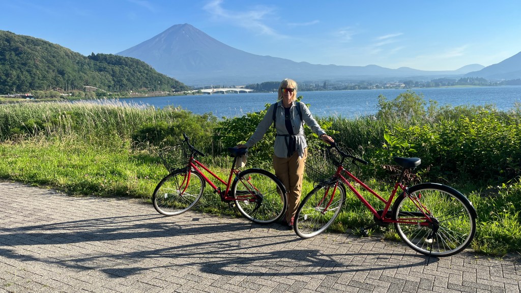 Between traveling from Tokyo to Kawaguchiko, walking, and checking into our hotel, there wasn’t much time left in the day. Fortunately, bike rentals here are available by the hour (500 yean per hour). We made the most of just one hour, managing to see both Lake Kawaguchiko, one of the Fuji Five Lakes, and the majestic Mt. Fuji. At a vegie market we got some wonderful fermented something-something, and had a chance to chat with a permanent resident of Japan. The following day we climbed Mt Fuji.