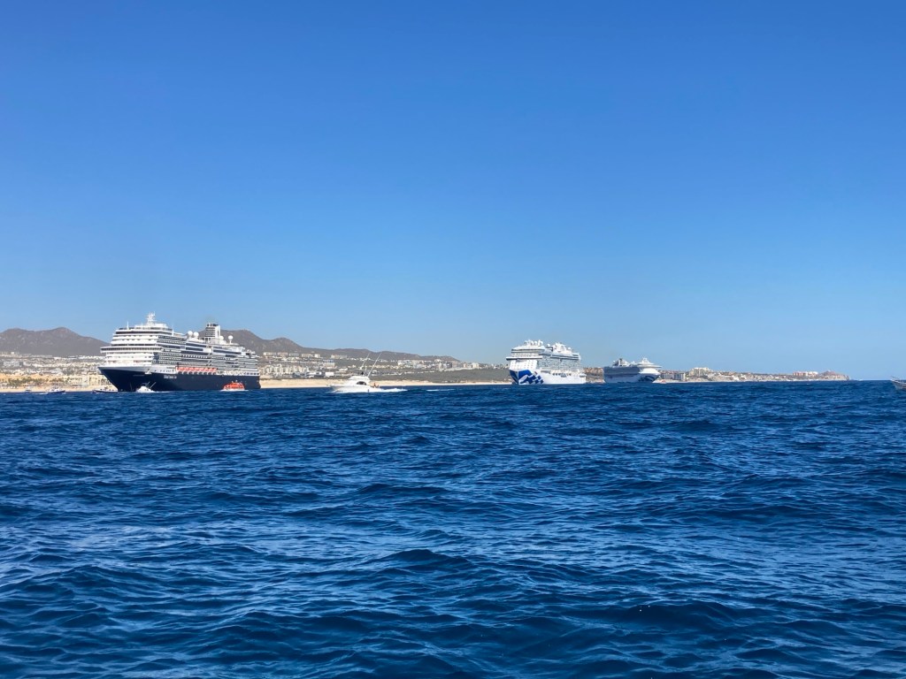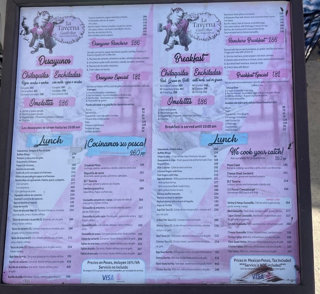 Except for the capital La Paz, which doesn’t feel like a big city, Baja is empty. Then we pop over the hill, and we are in Los Cabos. These three cruise ships alone have 16,000 people on them. Feedlots for humans.Navigation in Los Cabos is stupid. Wherever we wanted to go was under construction or gated off. Finally, 13.5 months after rolling out of Calgary, we are at the end of the Baja. Almost 60% of the way from calgary to the equator. We do a touristy boat tour. Dozens of boats full of tourists race between the view points. $15 to see 15 of the main attractions, including lovers beach and divorce beach.I expected Cabo to be stupid expensive, I’d heard from people about $800 dinners. Prices look normal to me – keeping in mind this menu is in Pesos.