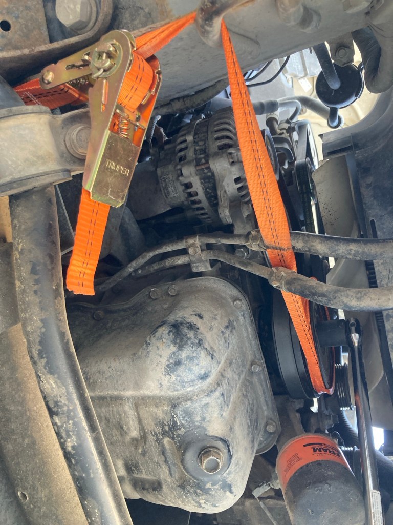 Drive up on a couple rocks in the shade of a supermarket. A cheap ratchet strap, and a little elbow grease, the new balancer comes off. The damage from the loose bolt has been done – the mating surface is no longer flat, and replacing that requires taking off the front of the engine. Will plan to do a timing belt replacement at the same time, when we fly down next year. So tighten up the bolt and drive on.