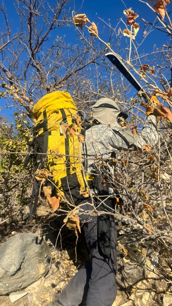 It was late when we finally escaped the town of Los Barilles. Nevertheless Chester pointed a short little named cerro on a map, Cerro de Portrerillos – minimum distance, minimum elevation gain, just perfect to make up and down it before the sun sets.Working a new machete in his new βsmart vaquero outfitβ on the way towards the Cerro
