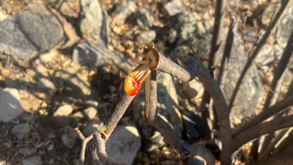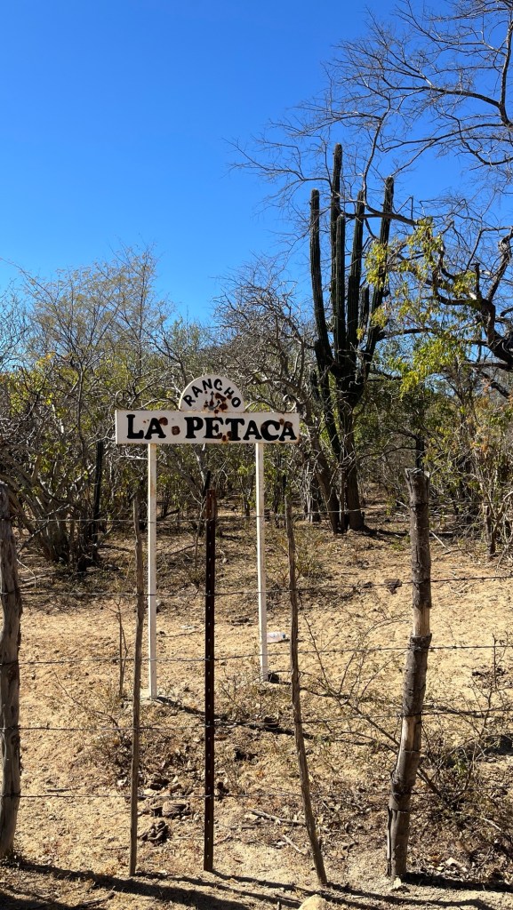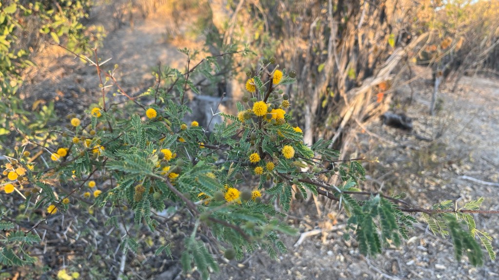 Interestingly branches when cut produce blood- looking sapNice big boulders decorate the summit of Cerro los Potrerillos.Easy to climb, and nice to sit onWe both can fit π View from the summit, the first hill of the year.No time to linger on the summit although surprisingly internet is here.We enjoy flowers of the desert Looking for a flat place to sleep we came across this rancho. Chester told me his uncle Ted used to decorate the fence in a similar fashion.