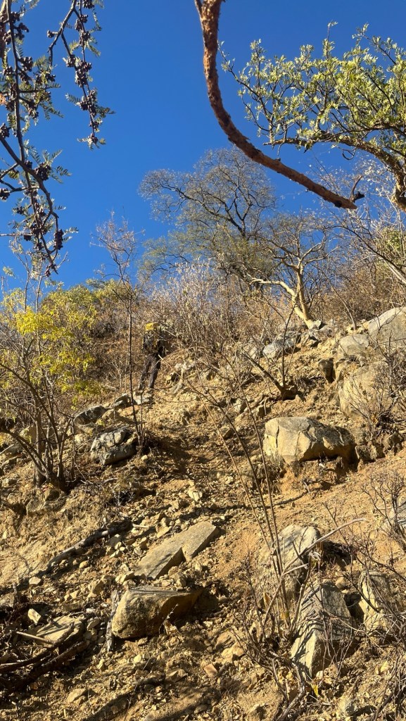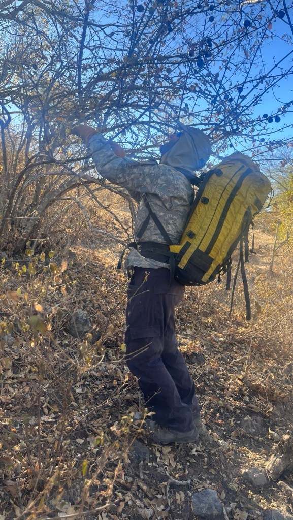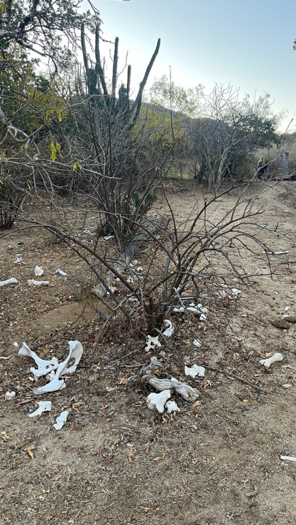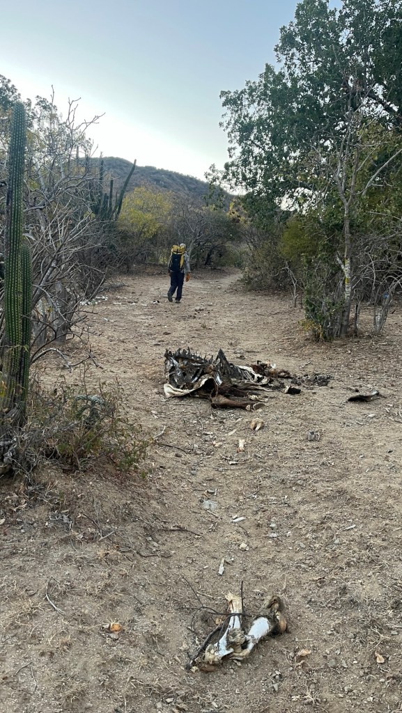The following day, Jan 3 we have a longer hike planned- Cerro el Encinoso. We start at civilian twilight to avoid the heat.Looks like not everybody made itGruesome And stinky – this is what happens when there is no rain for a yearLuckily the scenery improves and the route is clear.As we gain altitude vegetation changes. Now we see oaks, the bark of an oak is really distinct Final route to the summit is not bad. Once in a while there is a faint trail we can follow.Soon we are on a small summit of Cerro el EncinosoOn the way back Chester enjoys collecting wild figs. I no longer feel like eating them.Back to the ranch road