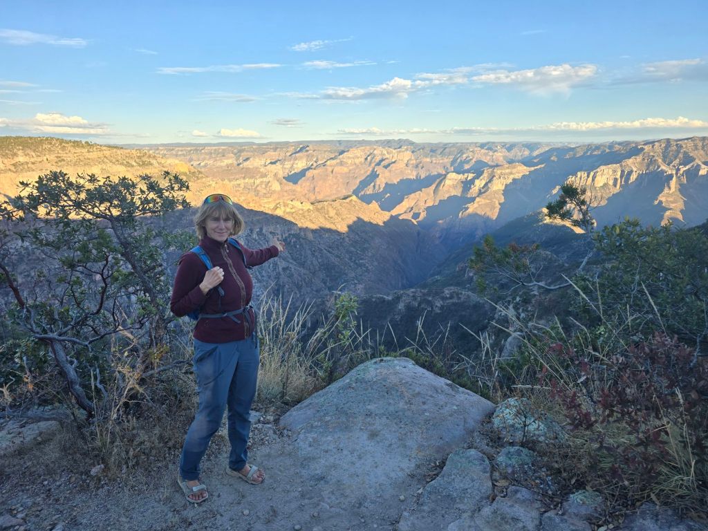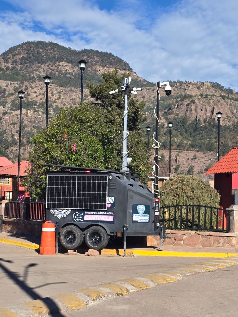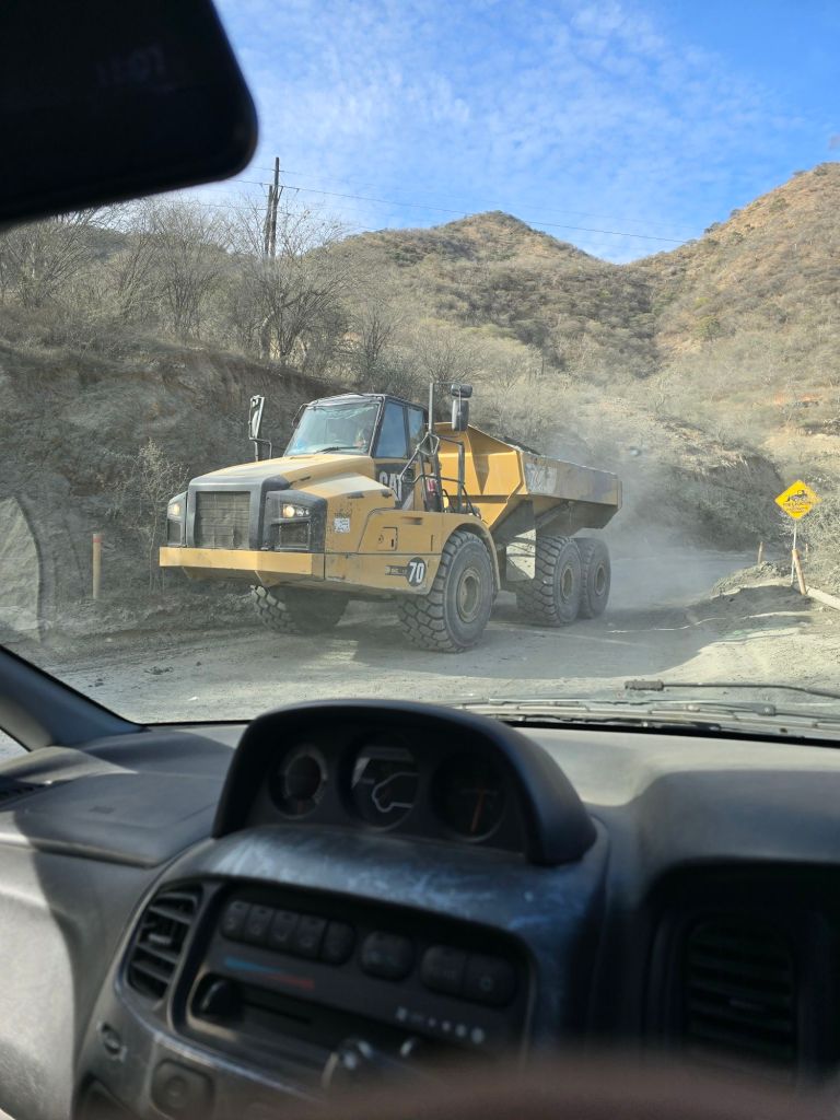 The road soon goes right through the heart of a copper mine “Bolivar”, owned by a Canadian company. Took us a while to figure out the rules of the road, which are quite simple – get out of the way of the loaded trucks going downhill.Must be an underground mine, judging from the stature of this loader. This looks like a complicated mine, competing against the giant Chilean mines to sell copper to China. Just up the hill is a big gold mine. The road starts improving, mines like this need good infrastructure.There are lots of small settlements on the steep canyon walls. We gave these ladies carrying their groceries a lift when it started to rain. Our experience of Mexico is so different from the horror show we read about on the news. It’s almost a disappointment when we get back to civilization and paved roads. Now we are close to the train route, and the towns are decked out for tourism. A standalone surveillance trailer for the police? Solar / cameras / Starlink. Now that we are on the main road paralleling the tourist train, the scenery and tourist attractions are cranked up yet again. This is likely the best viewpoint for the Copper Canyon.