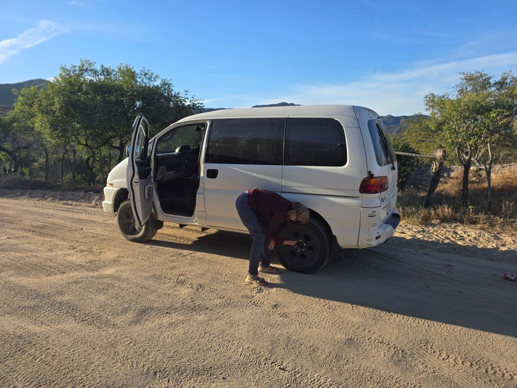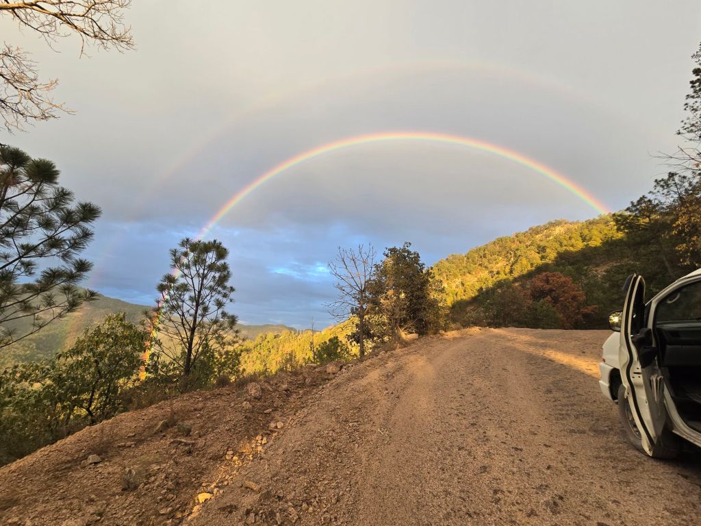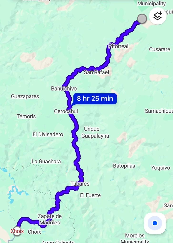 Our night in Choix was memorable. Everyone tells us to keep a low profile at night in Mexico, ideally behind a locked gate. No luck finding a campground, so we parked on a side street – security through obscurity. At 11pm, some kids ripping around on dirt bikes smacked into our bumper. We kept quiet until they left, and skulked away to find a quieter street…The road gets rough immediately after Choix, so we air down to 25 PSI. We have no beta on the road ahead to Creel, except both Google Maps and Maps.me show it as the only option. 250km of gravel?