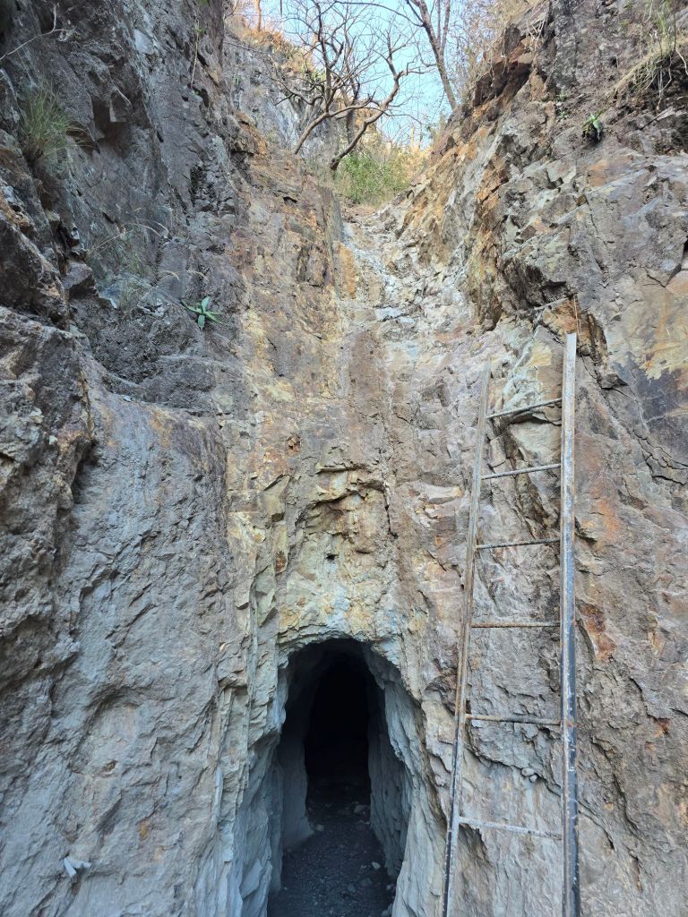 We drive down in the canyons to see a new silver mine. One of the miners is very curious about a cave that’s just down the Ravine from their mine, and asks me to get footage of it