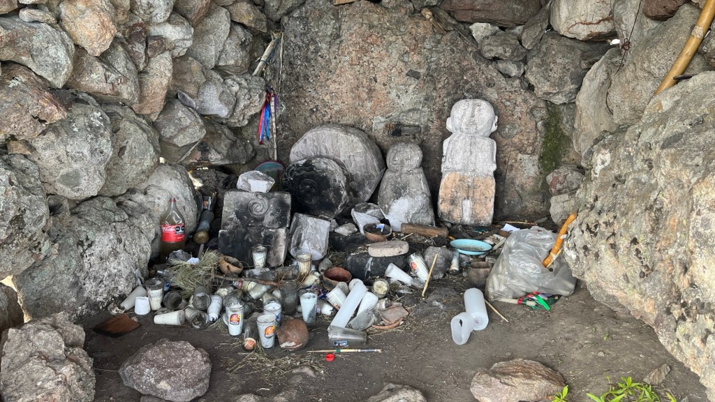 As we leave the main road, the access roads get progressively smallerFinally a tree barricades the access – although Chester still managed to squeeze through hereWe started the hike. Chester suggested following a streambed instead of hiking the ridge, which could have been steepIt was a steep hike all the way to the summit block. And then full stop. At first, we thought we were out of luck, but then we found a weakness in the steep wall. With just a bit of scrambling, we made it to the top.The summit has 2 little houses.In the houses there are offerings to the Gods of Corn and the God of Rain.I thanked the Gods for being able to make it to the top of this sacred mountain – the highest peak of Sierra Madre Occidental.