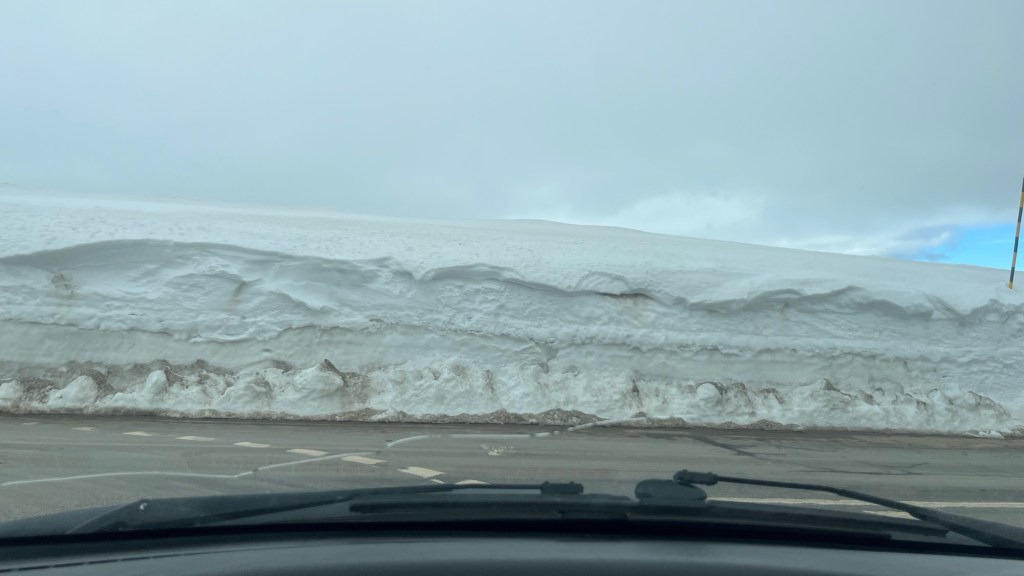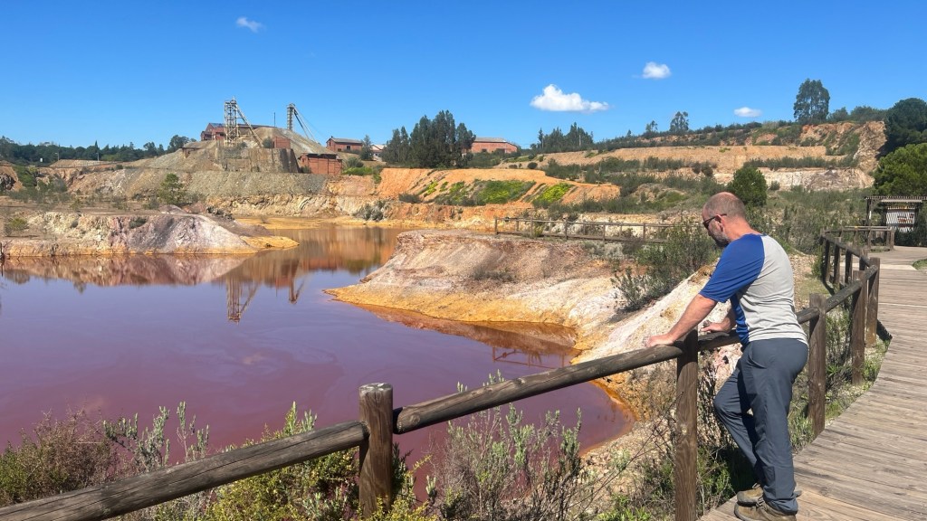 Our next destination of the day was Torre, the highest peak of Portugal on the mainlandSure enough there were impressive snow drifts close to the topView of the summit with three towersLooking in the other direction is a little storeAnd in another direction just the landscapeWe got some special sheep cheese from the summit. It is supposed to make you more adventurous. We will see…We got to the middle of Portugal and it’s time to head south. Otherwise we could miss the wedding of our friends Sonia and Jonas.As we drive south Chester finds a mine. They closed it and converted it to a touristic attraction. We sure enjoyed itWe also saw a lot of theseStorks – everywhere. I have never in my life seen so many storks! Chester even heard them clapping their beaks!None of them were delivering babies though 🦅 What’s wrong with them? Polish storks carry babies all the time.After the day of driving we almost reached Lagos, our final destination. But before that we stopped at two more prominent peaks. We drove of course- this is Portugal after all. This is Picota, and far in the distance Fóia.And this is my shadow on Fóia.Far in the distance are finally the promised beaches. We will enjoy them soonFor now this is our wonderful camping spot.